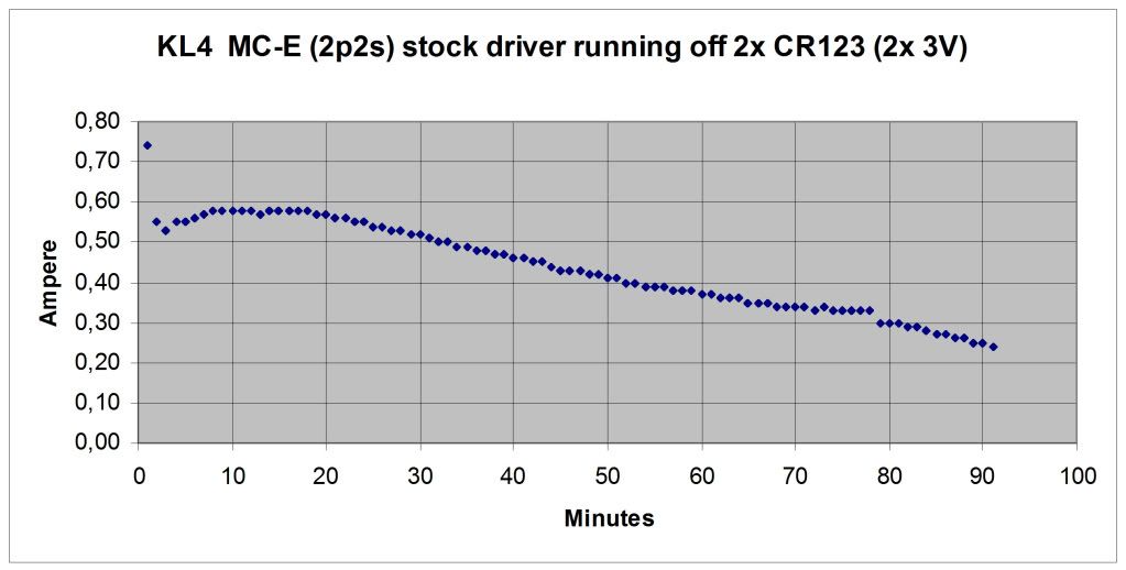 Before I actually started modding this L4 the 2p2s wired MC-E with stock driver was tested using my bench supply, primary – and rechargeable cells.